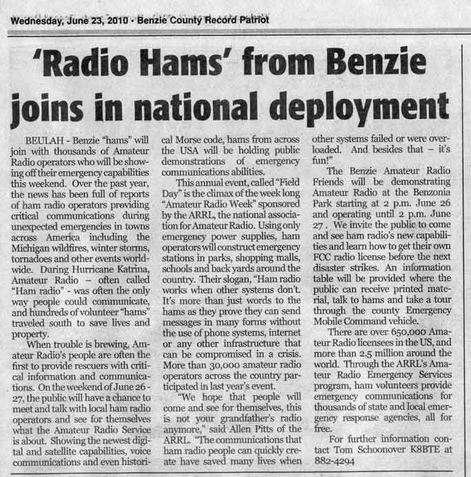 Thanks to AA4R & K8GWN for launching wires in the sky, W8TVC, WB4PHC, KG8CW, K8VY for Midnight Madness. WB4PHC & KG8CW were pounding the keys which helped our total points as CW counts two times as much as SSB. K8VY ran up the score on 6 & 10 meters this year. The ACE communicator of course was AA4R on 15 & 40 meters where we had a total of 514 SSB contacts and Bill made most of those. Thanks to KG8ZA for his ladder and tent, to the Sheriff for providing the Mobile Command Center for our number one operating position and for his visit along with Bill Sholten the Undersheriff. We are fortunate to have this great support from the Sheriff's department which also provides us with a nice radio room for our ARES/RACES emergency communications.