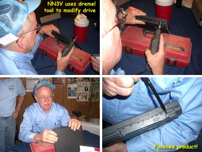 After dinner, Charlie, NN3V, Chief Guru of the IOOK Technology Department modified the drive for the laptop he had purchased. Even though the drive fit inside fine, the door would not close properly without a slight modification.