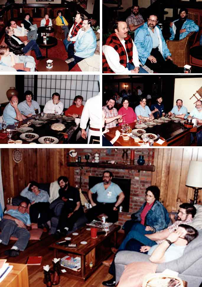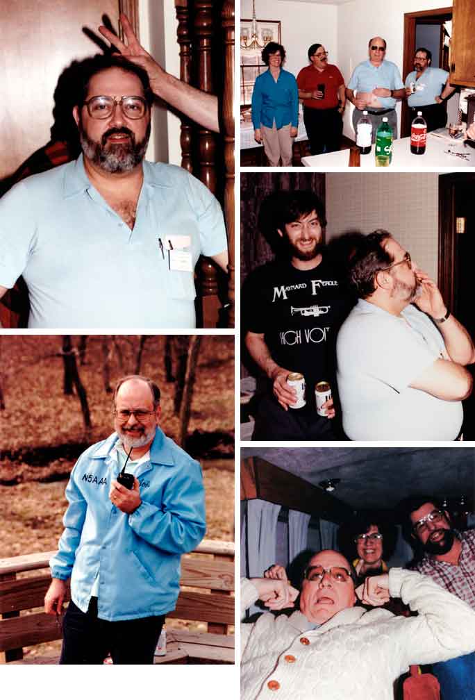 N0BIX has resurrected some snap shots from the March Indy Mini Gathering from 1989. First we see the rabbit taking a ride over WA8ZWJ's head. Next is the gang watching KBob, W8JUK, show off his gall bladder incision in John , N5AAA and Jan's, KA9VQS, kitchen. Below WA8ZWJ is contemplating something on the wall while W8ED shows off his Maynard Fergusson T shirt. Bottom left shows a stressed out N5AAA on his deck. Finally, KBob, W8JUK, is attempting a double IOOK salute while Judy and WD8JPP look on from behind!