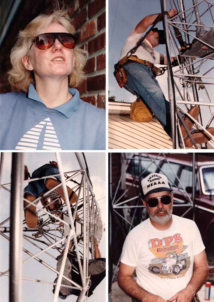 Man, I had forgotten about this Mini Gathering. N0BIX brings memories back that had slipped away with this series of photos from August of 1989. Below left, Jan, KA9VQS looks on while John, N5AAA works on grounding the various sections of the tower together in an effort to reduce spurious noise and provide an earth ground for counter poise for an antenna installation. Below right, John, N5AAA works at the rotor area. Bottom left, Keith, WA8ZWJ joins John on the tower.
