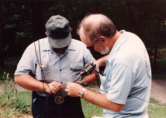 Below Keith and John make final solder connections to the wire antenna to be installed.