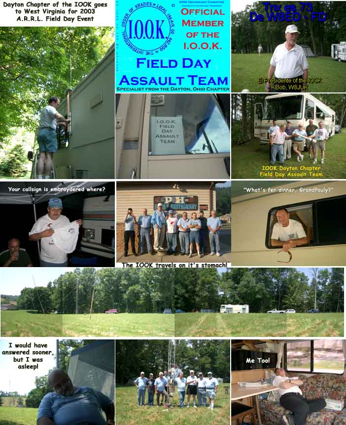 This was the year that the Dayton area IOOK Field Day attendees became the "Field Day Assault Team"! This team of Field Day Specialists assaulted the Harrisville, West Virginia IOOK Field Day site hosted by Da Bear, KE8NK! The Assault Team consisted of Fast "Flow Manager" Eddie, W8ED; "Dealin' Dave", N8DRM; David "Dr. Miller" KC8UAW; "Fist" Farley, WA8ZWJ; "Rousting" Randy, AB8CO and Lou "Potato Gun" Pauly, N8KXM. As a special surprise, our illustrious President for three lifetimes KBob, W8JUK and his XYL, Rosie, W4RZF attended the activity from Kill Devil Hills, NC.