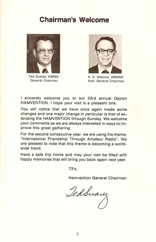 He was very active in Ham Radio. So much that in 1964 he served as the President of the Dayton Amateur Radio Association (DARA). He also served as the General Chairman of HamVention during 1973, 1974, 1975 and 1976 - the 22nd, 23rd, 24th and 25th HamVentions! Below is the "Chairman's Welcome" page scanned from the 23rd Dayton HamVention Souvenir Program. He is the only person to have served as General Chairman of four consecutive HamVentions!