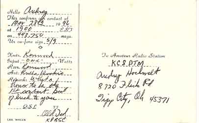Ted was one of the first hams in the Dayton area to have a personally owned repeater on UHF. The antenna was on top of an 80 foot tall tower in his back yard in Vandalia. He encouraged use of his repeater. Before the Union Machine obtained the ability to be heard at it's present level, many IOOK'ers used Ted's machine as a regular place to hang out. He was Audrey Hochwalt's (KC8DTM) first contact (Audrey is Glenn, W8AK's wife). Below is the QSL card that commemorated her first contact "on the air".