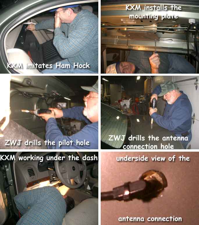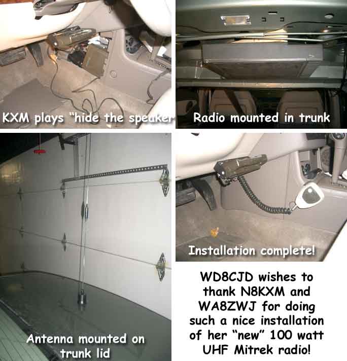 On Sunday, January 2nd, Lou, N8KXM (King of the "Clean Installation Dynasty") and Keith, WA8ZWJ (King of the "Drill The Antenna Hole Here Dynasty") installed a "new" to her 100 watt 3 channel UHF Mitrek in Marian, WD8CJD's new 2004 Malibu. The Mitrek radio was converted from commercial service to amateur service by Johnny, KF8KK (King of Mitrek Conversion) this past summer.