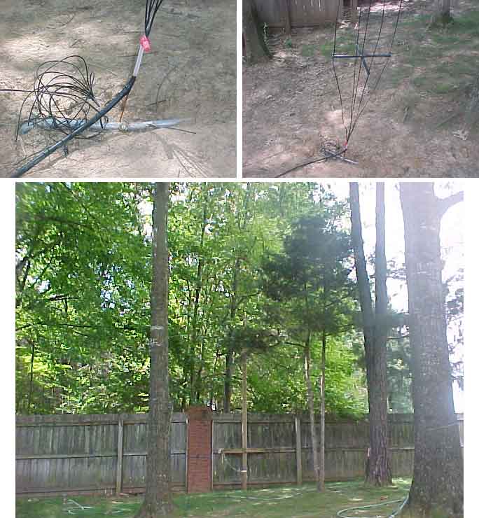 Tom has erected a new "stealth" vertical antenna. It is very much like the fan dipoles that many hams use except it is in a vertical format. It is a multi band antenna using a single feed line.