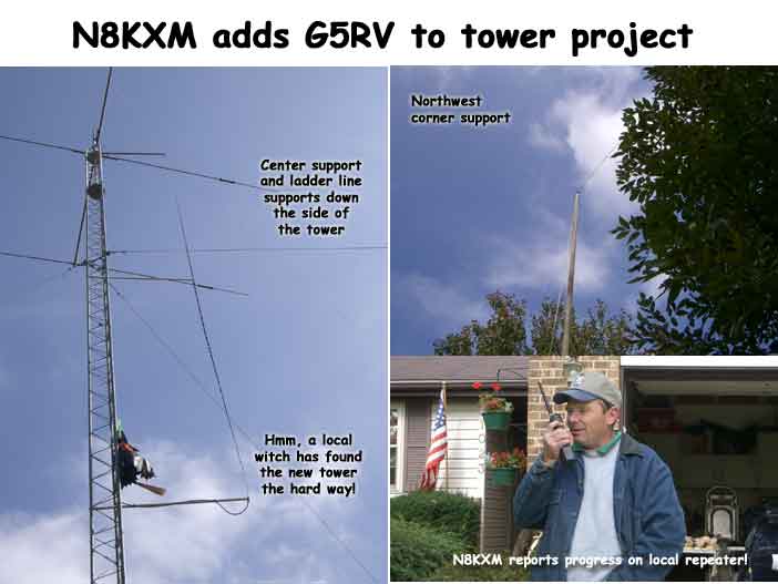 Another improvement was made to N8KXM's tower on 8/7/04. Lou added a side arm bracket and installed a dual band vertical antenna and a 6 meter vertical antenna. He had done his homework, having been up the tower the evening before and had run the coax in preparation for the climb. After finishing the tower work he drilled a couple of holes and we fed the coax into the shack and adjusted it to the proper length and installed coax connectors and everything worked just fine! As you can see, the weather was PERFECT! The severe clear blue sky was so bright that it almost hurt your eyes! Beautiful!