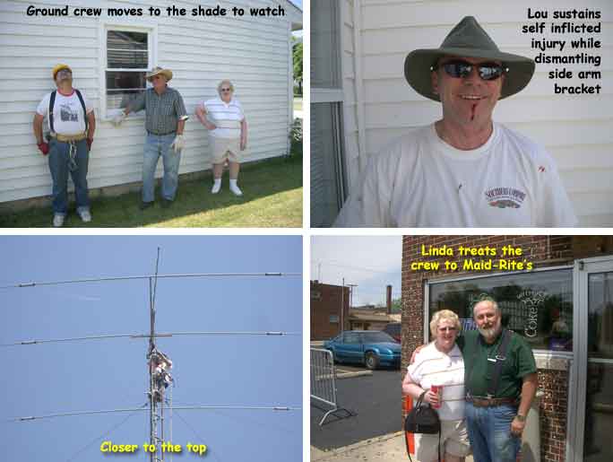 On Thursday, June 22, 2006 and Wednesday, June 21, 2006 the IOOK Tower Team consisting of N8KXM, KA8ZBW, WB8WIQ and WA8ZWJ took down Linda, WD8BYX's tower. The tower had been erected 35 or more years ago by Dale, WA8EEA. Linda and Dale collected and organized the "History Of The IOOK - the first 10 years" and placed it into book form and Linda presented the collection to the IOOK at the "Gathering Of The Faithful" fifteen years ago. Linda is preparing to sell the house and needed the old tower to be removed. Upon our arrival at Linda's we were surprised by the large number of antennas and weather equipment that had been mounted on the tower over the years. What we had planned to do in one day quickly shaped up to be a two day job for the team.