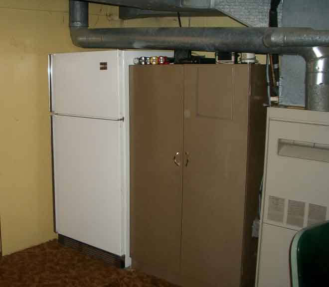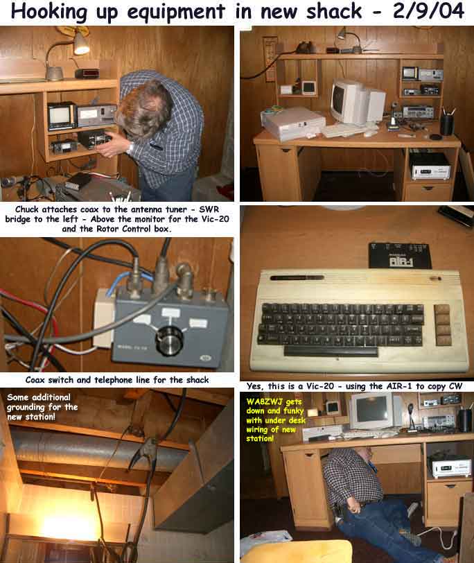 The curtains are RED and there is a RED shaded light in the corner of the room - giving it a taste of a bordello! Chuck has plans to continue working on his new radio room to include a sitting area for visitors....to visit! This new area is spacious compared to his former shack and Chuck is looking forward using to his newly claimed space in the comfort of his new office chair! The PC is a new-to-him Gateway machine. On the shelves to the right you can see a small TV monitor for the Vic-20 computer used for back-up copying of Morse Code, antenna rotor control, SWR bridge, antenna tuner, a rarely used microphone, Bencher key paddle, MFJ keyer, ClearSpeech Base and Kenwood TS-440S transceiver. Over Chuck's left shoulder you can see through the door the refrigerator and cabinet that replaced the space where the old shack used to be.