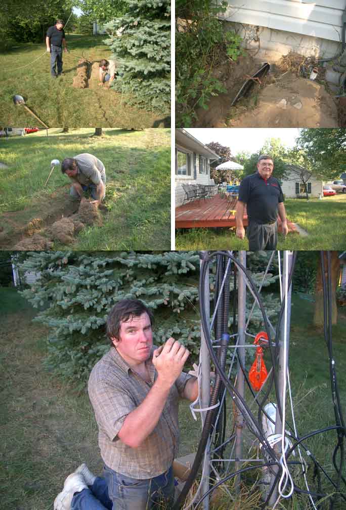There were actually two projects going on at once. Johnny (being quite in digging mode having recently moved lots of dirt for a driveway project at his place) made digging the trench to bury the hard line and other cables look like short work. At one point, when he was working grounding the shield of the cable to the tower ground system, it looked as though he was lifting up a prayer and saying "Please, God, let this work!" While he dug and buried cables, Dave and I worked on getting the 40 meter dipole and the G5RV antenna up into the new position on the tower. The center supports for both wire antennas are suspended from the same tie point and pulley and are separated vertically about 10 or 12 feet with the 40 meter antenna on top. We were able to use the same end tie points for 3 of the 4 ends and took the west end of the G5RV a bit further south than before to keep the leg away from the tower. All initial RF tests indicate that the antennas are resonant where they should be. We shall see how they perform as the next series of IOOK schedules present themselves!