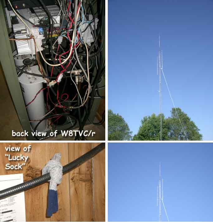 As you can see, the weather cooperated very nicely for today's efforts. This is the first stage in a series of upgrades and changes for the wI0OK/r and W8TVC/r repeater systems. The hard line to the repeater antenna has provided quite an increase in the coverage of the W8TVC/r system. Here at the cottage (about 20 miles away) I had been using a 170 watt amplifier to get into the repeater reliably. I can do so with 5 watts now! Incredible! Congratulations to Johnny for a successful tower climb and productive improvement in the first stage of the project! 73, Keith!