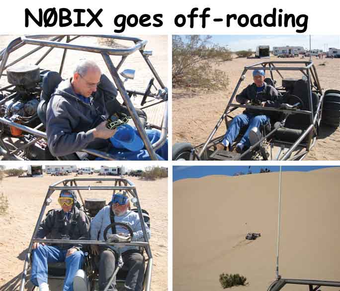 As Hoss (WA5ZAI) and Keith (WA8ZWJ) head east towards Valley Mills, Texas, John (N5AAA), Jan (KA9VQS) and Bob (N0BIX) head west to a place in southern California where John and Jan frequently meet friends and do some off road playing in the sand. They arrive Sunday afternoon and spend the night in the desert. On Monday (President's Day) they take part in the fun! This is Bob's first off-road experience in a dune buggy. Below, Bob looks through the equipment he has been given to wear during the ride. Next, Bob screws his IOOK hat on tight into "lock position" so it won't get lost in the wind and sand. In the lower left, John finishes belting himself in while Bob practices keeping his mouth closed. :-) Finally, you see them going up the side of the dune! Yee haw! What fun! According to a close source, N0BIXie is still finding sand in places he didn't know he had places!
